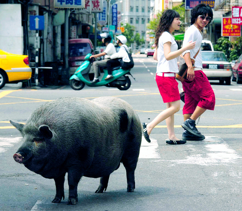English Teacher Peter Dearman was on his way to a convenience store in Tianmu when he was struck by an usual sight -- a tiny striped porcine creature stranded in the traffic.
