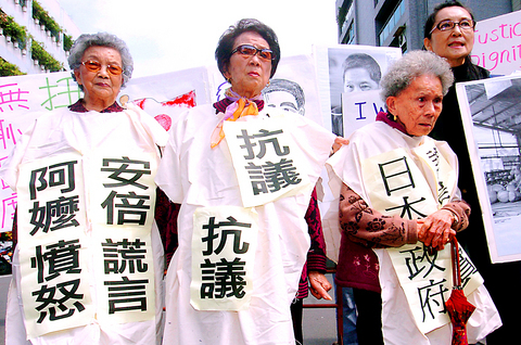 "Abe's statement has shocked many Asian countries ... It's a complete denial of historical facts," said Fran Gau (高小帆), executive director of the Women's Rescue Foundation. "We're here to demand the Japanese government admit the wrongdoing, apologize and compensate these victims."