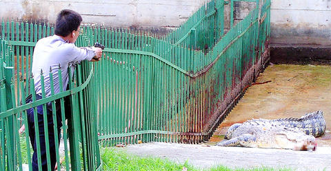 A crocodile was shot dead at Kaohsiung Shoushan Zoo yesterday after biting off a veterinarian's forearm when he was trying to treat the sick animal.
