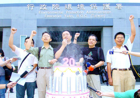 The Environmental Protection Administration (EPA) celebrated its 20th anniversary yesterday, and received a "tumor cake" as a gift from environmental protection groups keen to highlight what they see as the deterioration of the nation's environment.