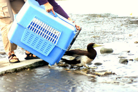 An adult brown booby (sula leucogaster) -- a large seabird belonging to the gannet family -- thought to have been blown off course by Typhoon Krosa was released into the wild yesterday.