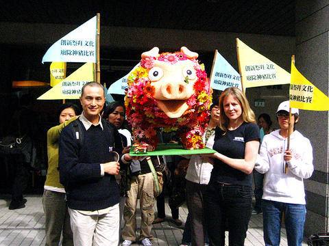 After the press conference a parade of ACFA volunteers boarded a bus to Sansia's Master Temple to offer them "an alternative way to respect God" -- a colorful, life-sized, smiling pig made of cardboard and decorated with flowers and candy, Wu Hung said.