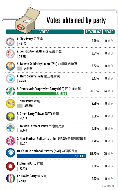 Official results announced by the CEC showed that, other than the DPP and the KMT, no other parties were able to secure more than 5 percent of the party vote.