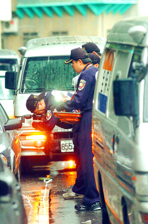 The two Taiwan Secom Co (中興保全) guards were collecting cash from a branch of the Taiwan Post Office in Wanhua District at 2:50pm and preparing to leave when they were ambushed by a man who fired 10 shots at them, police said.