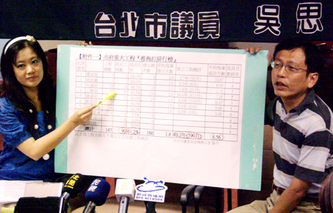 DPP Taipei City Councilor Chou Wei-yo (周威佑) said tha t many construction projects, including the mass rapid transit (MRT) system’s Xinzhuang and Xinyi lines, the Shanzhuku (山豬窟) landfill in Nangang District and the cleaning of the Neihu dumping site had all been delayed without new deadlines being announced.