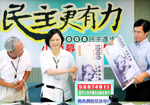 Democratic Progressive Party (DPP) Chairwoman Tsai Ing-wen (蔡英文) yesterday jokingly invited President Ma Ying-jeou (馬英九) to donate money as the DPP launched a fundraising campaign to alleviate its financial woes.