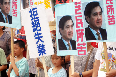 “Being jobless is not just a problem for the unemployed worker, it also affects their circle of friends and their families,” Hsiao Chung-han (蕭忠漢) of the Association for Rights of the Unemployed told the demonstrators, many of whom held placards showing images of Ma above the words “feel the pain of the people.”