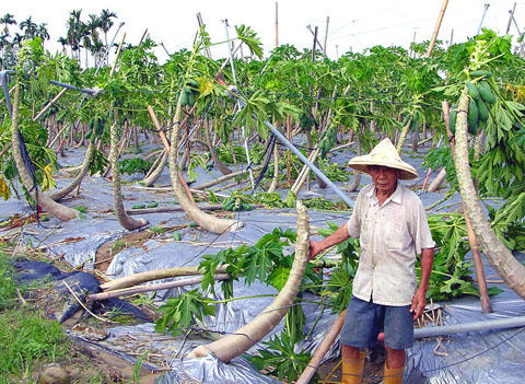 A Chiayi County farmers’ association official urged agricultural authorities yesterday to help the county’s papaya farmers cope with losses suffered as result of a tornado and hailstorm that struck Jhongpu Township (中埔) on Thursday. Chang Han-ching (張漢清), a secretary at the Jhongpu Farmers Association, said the tornado and hailstones damaged about 30 hectares of papaya plantations in villages including Jinlan (金蘭), Fushou (復收), Longmen (龍門) and Sanceng (三層), causing millions of dollars in losses. Screen houses were damaged and fruit trees were either snapped in half or toppled over, Chang said. The Jhongpu Township Farmers’ Association would help the farmers apply for government subsidies and expressed hope that agricultural units would also help to offset the farmers’ losses, Chang said.