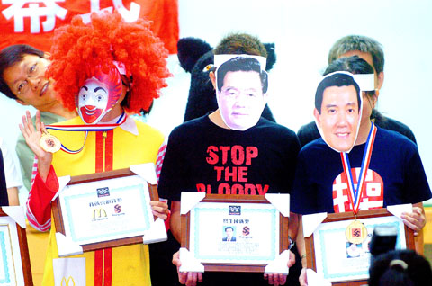President Ma Ying-jeou (馬英九), Chinese President Hu Jintao (胡錦濤) and Ronald McDonald were among the gold medal winners for human rights abuses at an unofficial Olympic closing ceremony in Taipei yesterday.