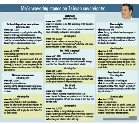 “His campaign slogans were too dramatic, and now he blames the global economy when failing to improve the situation. Didn’t he know the global economy was heading for recession when he made his promises?” said Shih Cheng-feng (施正鋒), dean of National Dong Hwa University’s College of Indigenous Studies, referring to Ma’s prominent campaign slogans — “Ma will turn things around right away” and “We are ready!”