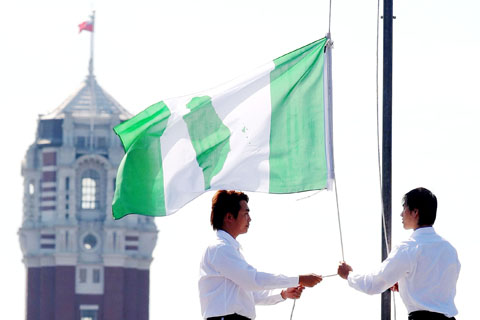 Shouting “Taiwan Republic! Taiwan Republic!” thousands of Taiwanese independence supporters gathered for a flag-raising ceremony in front of the Presidential Office yesterday, using the group’s version of a Taiwanese national flag.