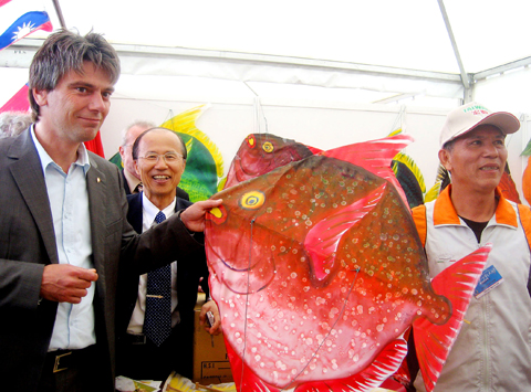 At the Taiwanese pavilion, set up by the Taiwan Yunlin Kite Association, a bright red fish-shaped kite caught the attention of Jumel and a group of Dieppe City councilors. The kite was presented to Jumel as a memento by Tsai Wen-fu (蔡文福), a kite-making master from the association.