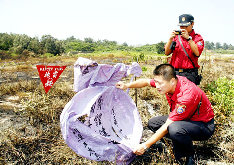 Chen Lu-yiang (陳莒揚), head of the Kinhu firefighting division in Kinhu Township (金湖), said the fire occurred at around 10pm and the division sent two vehicles to the scene. However, because the fire was in a barb-wired mine zone, firefighters could only stay on the alert outside.