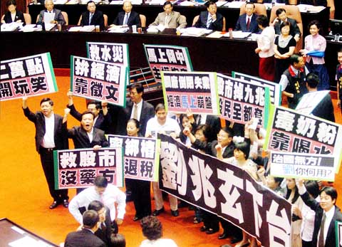 Shouting “Liu Chao-shiuan, step down” and waving large posters, DPP lawmakers several times blocked Liu from taking the podium, which twice resulted in Legislative Speaker Wang Jin-pyng (王金平) sending the session into recess.