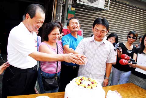 Yonghe Mayor Hung Yi-ping (洪一平) and neighbors offered him cakes and red envelopes containing money to wish him “a good new life.”