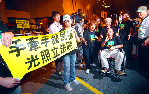 The demonstrators were there in support of Tsai Ting-kuei (蔡丁貴), chairman of the Taiwan Association of University Professors (TAUP), who was on day seven of a hunger strike intended to call attention to what he said were fundamental problems with that law as well as the legislative election system.