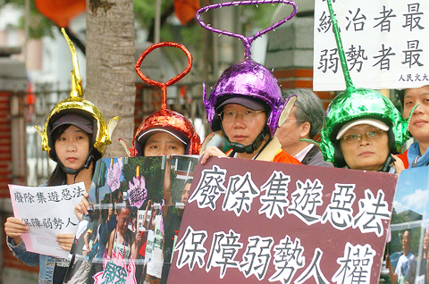 Saying that the Assembly and Parade Law (集會遊行法) restricts people more than it protects them, several civic groups demonstrated outside the Legislative Yuan yesterday, demanding that the law be abolished.