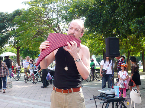 Every Saturday and Sunday morning, Canadian pan flute artist Bernier Sylvain drives to Tamsui MRT Station and waits for the draw with other street artists to secure a performance spot at the rear of the station.