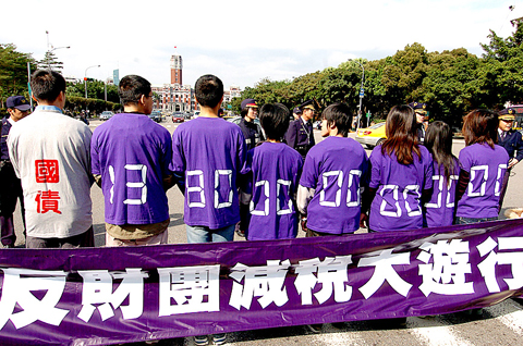 Concerned that efforts to stimulate the economy will only increase the national debt, the Alliance for Fair Tax Reform (AFTR) created a “human national debt clock” on Ketagalan Boulevard in front of the Presidential Office yesterday.