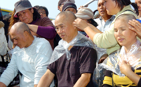 Film director Hou Hsiao-hsien (侯孝賢) shaved his head to show support for residents of the Sanying Aboriginal Community (三鶯部落) who staged a demonstration yesterday to protest a Taipei County Government plan to demolish the community.