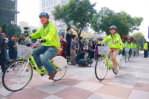 The move follows similar efforts in Kaohsiung City, which inaugurated its own public bicycle rental network on Tuesday. Kaohsiung Mayor Chen Chu (陳菊) said that about 50 bike rental sites would be established along the city’s MRT routes by the end of May, providing a total of 4,500 bicycles.