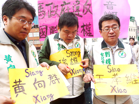 Making the statement near the Taipei MRT’s Ximen station, Democratic Progressive Party Taipei City councilors Chuang Jui-hsiung (莊瑞雄) and Liu Yao-ren (劉耀仁) covered the letter “X” on the Ximen Station nameplate with an “S” sticker.