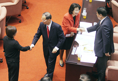 Ma led Liu, Wang and KMT Chairman Wu Poh-hsiung (吳伯雄) to thank the legislature for approving the budget.