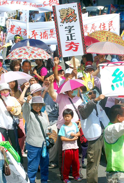 Thousands of Pingpu (平埔), or “Plains” Aborigines, rallied in front of the Presidential Office yesterday demanding that the government restore their Aboriginal status. With many dressed in traditional outfits and holding traditional instruments, they chanted slogans and sang as they marched from the Legislative Yuan to Ketagalan Boulevard.