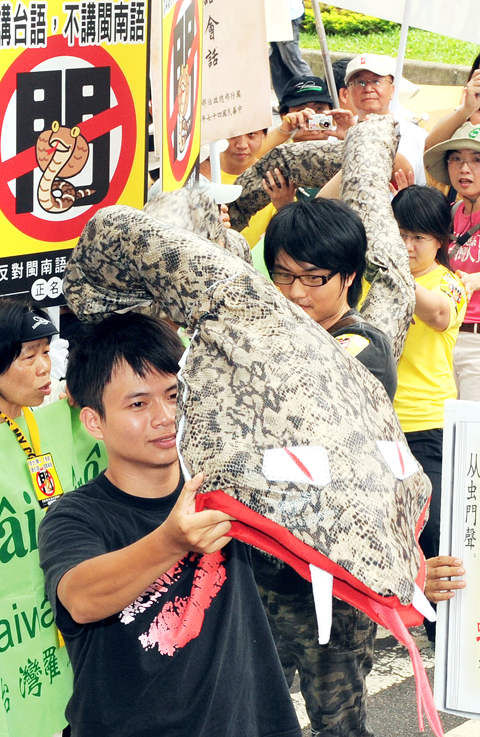 About 100 demonstrators attended, carrying placards that read “I live in Taiwan, I don’t speak Minnan. Don’t call me a speaker of Minnan” and a giant snake toy to represent the Chinese character “min.”
