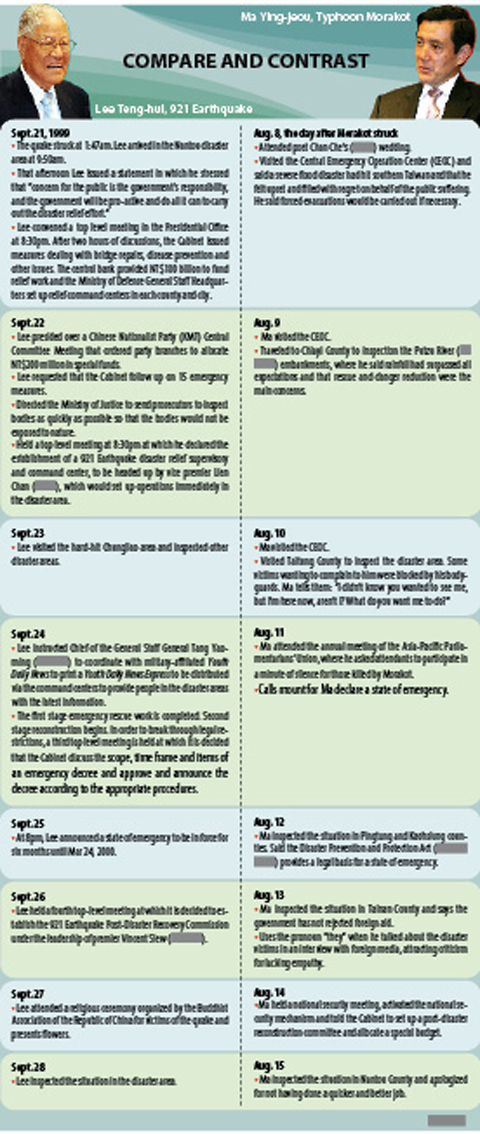 While Premier Liu Chao-shiuan (劉兆玄) insists the government has reacted quickly to the disaster, Chen Yi-shen (陳儀深), a historian who has studied the rescue efforts after the 921 Earthquake, said the answer was clear when people compare the response to disasters by Ma’s government and former president Lee Teng-hui (李登輝).