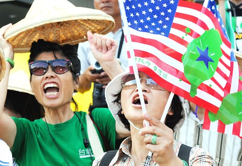 More than 300 protesters gathered in front of the American Institute in Taiwan (AIT) yesterday to urge the US to recognize Taiwan as an incorporated territory and assume full authority for its “military occupation.”