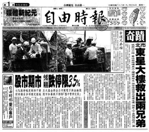During the six days before the younger Sun, who was 19 years of age at that time, dug a tunnel behind a smashed refrigerator and crawled out of the rubble, the two brothers stayed alive by eating rotten apples and drinking stale water and their own urine. In the darkness, they called out each other’s name to confirm their existence and Sun Chi-fong had his 24th birthday celebration under the ruins.