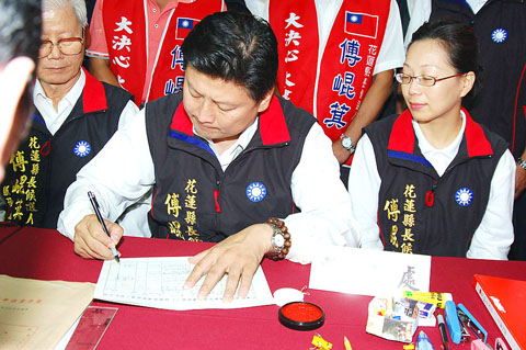 Chinese Nationalist Party (KMT) Legislator Fu Kun-chi (傅崑萁) completed the registration process for the Hualien County commissioner election yesterday even as his party promised to discipline members who run in the year-end elections against the party’s wishes.