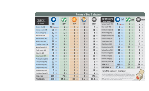 The DPP won a total of 128 county or city council seats in the 17 cities and counties where council elections were held on Saturday, while the KMT secured 289.