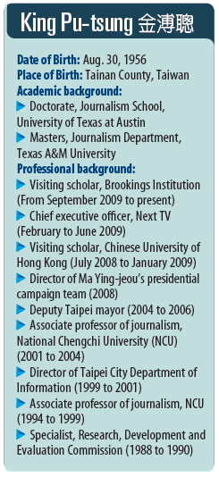 Political pundit Ku Chung-hua (顧忠華) of National Chengchi University said King’s top priority will be helping Ma to win the 2012 presidential election.