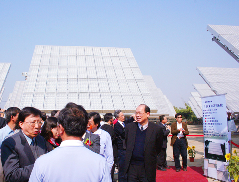 The completion of the nation’s largest high-concentration photovoltaic (HCPV) solar power plant was announced yesterday at a ceremony attended by Kaohsiung County Commissioner Yang Chiu-hsing (楊秋興) and former premier Liu Chao-shiuan (劉兆玄).
