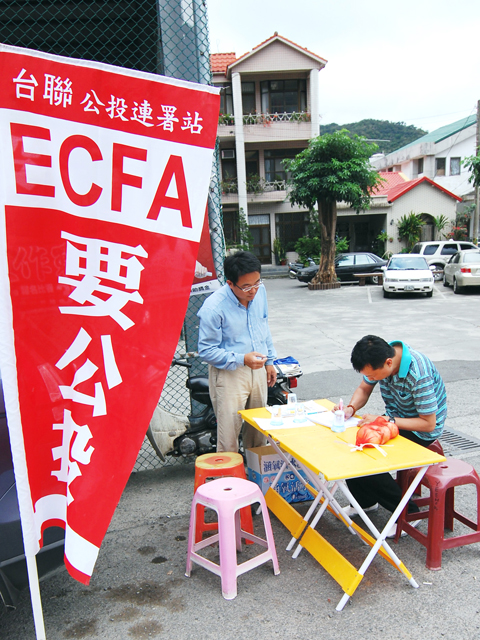 Government authorities have asked that electronic information displays in Taipei Main Station and trains operated by the Taiwan Railway Administration (TRA) run ECFA infomercials. Messages scrolling on the information displays include: “ECFA is to protect Taiwan and is a road to the rest of the world,” and “ECFA is to help people do business and increase Taiwan’s economic competitiveness.”