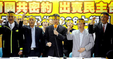 Officials and representatives from at least eight groups held a joint press conference in Taipei, chanting that they were against “secret negotiations between the Chinese Nationalist Party (KMT) and China that sell out a democratic Taiwan.”