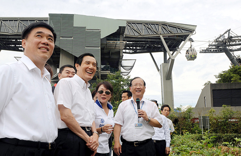 President Ma Ying-jeou (馬英九) took the Maokong Gondola yesterday for the first time since the system resumed operations in March. He praised the system’s safety — for the first time — and its upgraded infrastructure as well as Taipei Mayor Hau Lung-bin (郝龍斌).