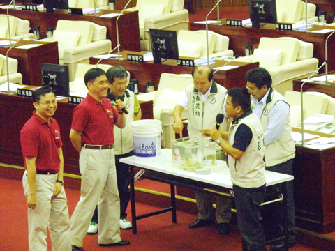 During a question-and-answer session with Taipei Mayor Hau Lung-bin (郝龍斌), DPP Taipei City councilors Chuang Ruei-hsiung (莊瑞雄), Huang Hsiang-chun (黃向群) and Liu Yao-ren (劉耀仁) prepared a tank with two plastic boxes inside, one with Hau's photo and one with a photo of his DPP opponent, former premier Su Tseng-chang (蘇貞昌).