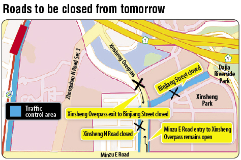 The Taipei City Government will close several major traffic routes for more than nine months from tomorrow, ahead of the start of the Taipei International Flora Expo in November.