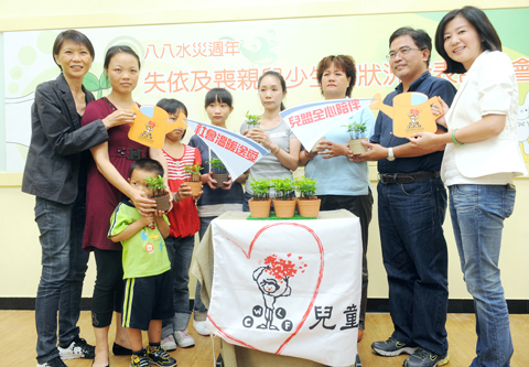 After the victims shared their stories about how they had coped after Morakot took away their loved ones, first lady Chow Mei-ching (周美青) gave them flowers and a hug.