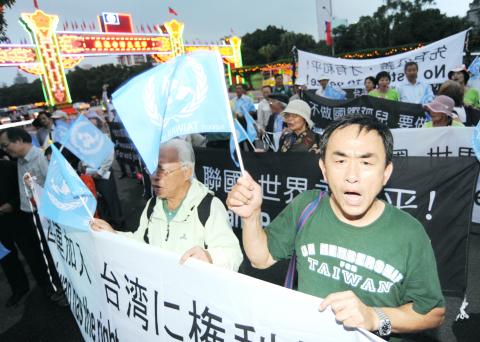 Dozens of protesters yesterday marched in front of the Ministry of Foreign Affairs, calling for an end to China’s opposition to Taiwan’s entry into the UN.