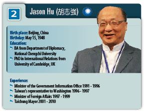 After receiving a doctorate in international relations from the University of Cambridge in the UK, Hu returned to Taiwan to start his public career in the Chinese Nationalist Party (KMT)-controlled government. In 1991, Hu was appointed as minister of the Government Information Office, in 1996 he became Taiwan’s representative to Washington and two years later, Hu was appointed to the post foreign minister.
