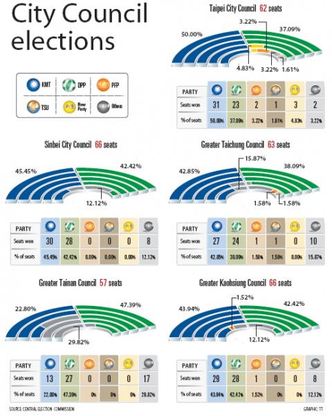 Elections yesterday to select a total of 314 city councilors in Taipei, Sinbei, Taichung, Tainan and Kaohsiung ended in a tie between the Democratic Progressive Party (DPP) and the Chinese Nationalist Party (KMT), with each winning 130 seats.