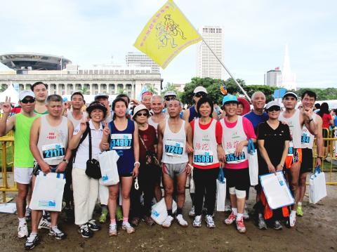 Members of the group, led by Exercise Association of the Visually Impaired in Taiwan director Chang Yuan-lung (張淵隆), challenged themselves in either the 42km full marathon or a half-marathon that took place at the same time.