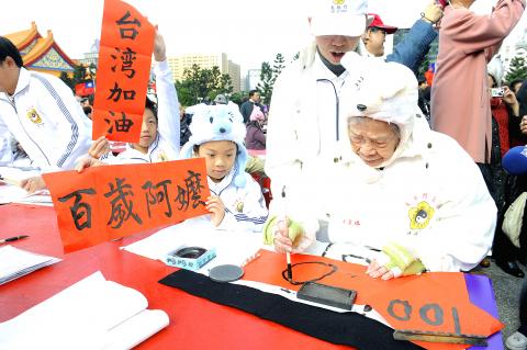 Chen Yeh Tsai-mei (陳葉再妹), who does not read or write Chinese, drew the number 100 to celebrate the centennial of the ROC, while wearing a rabbit-shaped hat. The 100-year-old great grandmother speaks only Hakka and Hoklo (commonly known as Taiwanese). It was the second time she has attended the event.