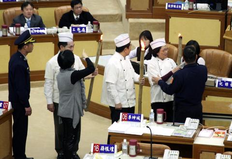 Dressed as chefs, Democratic Progressive Party (DPP) councilors carried six lit torches into the council chamber, just days after a fire at a Greater Taichung pub killed nine people and injured more than 12.