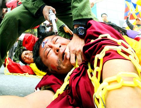 “The ‘skit’ that the Tibetans just performed is not really a ‘skit,’ because it’s something that has happened a lot during the past decades to Tibetans living within Tibet under Chinese occupation,” said Son Yu-lian (孫友聯), secretary-general of the Taiwan Labour Front, which was one of several civic groups taking part in the Free Tibet parade.