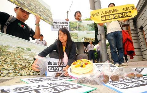 A group of protesters demonstrated in front of the Presidential Office yesterday to urge the government to clean up the toxic heavy metal and dioxin dust polluting the river mouth of their beloved Dadu River (大肚溪), which flows between Taichung and Changhua Counties.